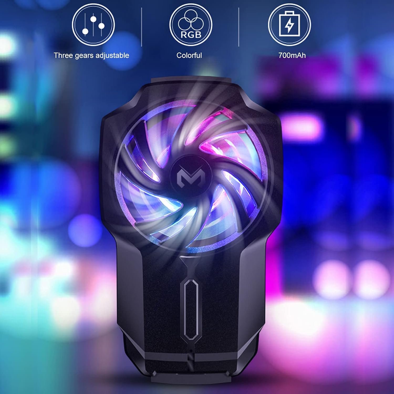 مروحة تبريد الهاتف تحافظ على هاتفك بارداً أثناء اللعب أو الاستخدام المكثف تصميمها المبتكر يوفر أداء عالي مع إضاءة RGB جذابة ومريحة للعين.